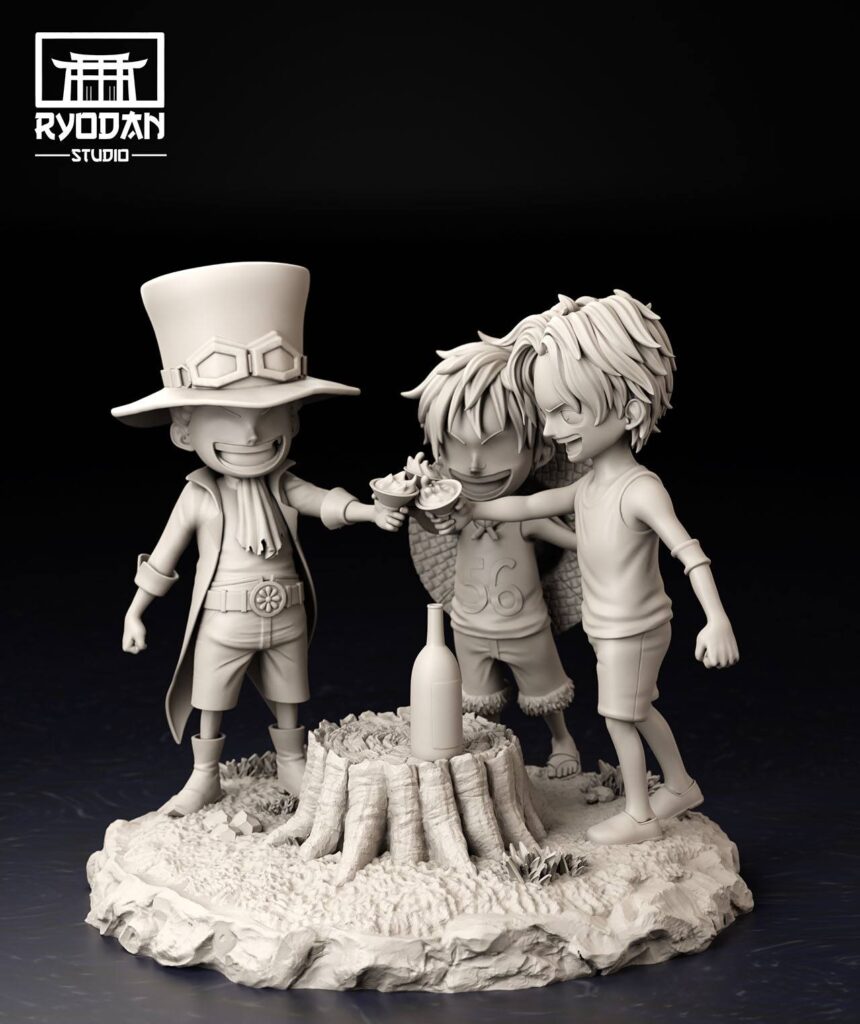 Un diorama de One Piece de uno de los momentos especiales de Luffy con Ace y Sabo cuando eran niños y brindaron con sake por su sueños.